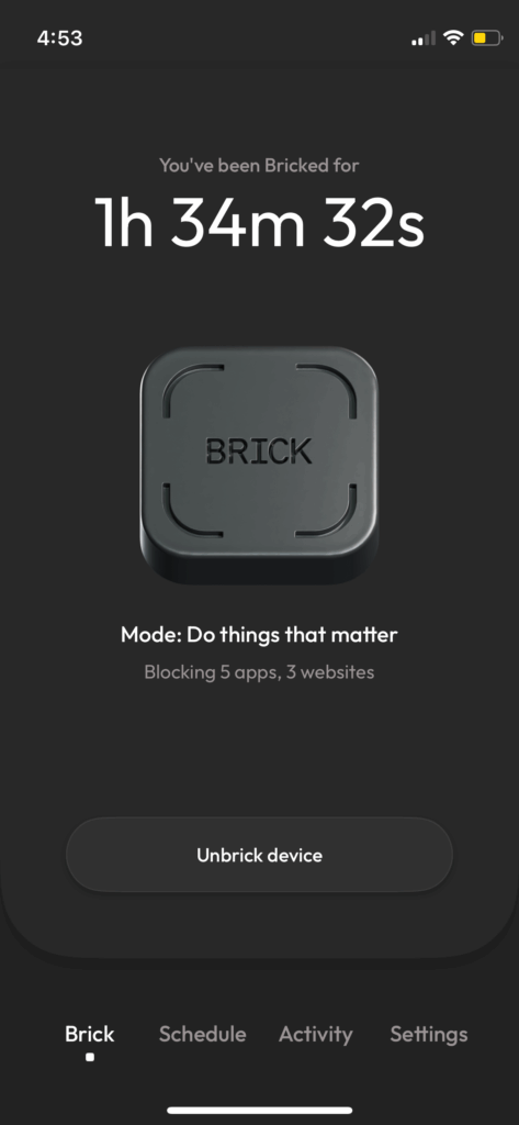 ✔️You can’t unlock apps from your phone. One of the problems with productivity apps is, they’re so easy to unlock. All you have to do is pick up your device and have a small lapse in judgment. With the Brick, you physically have to walk to the Brick device (mine’s on my fridge) to unlock it.